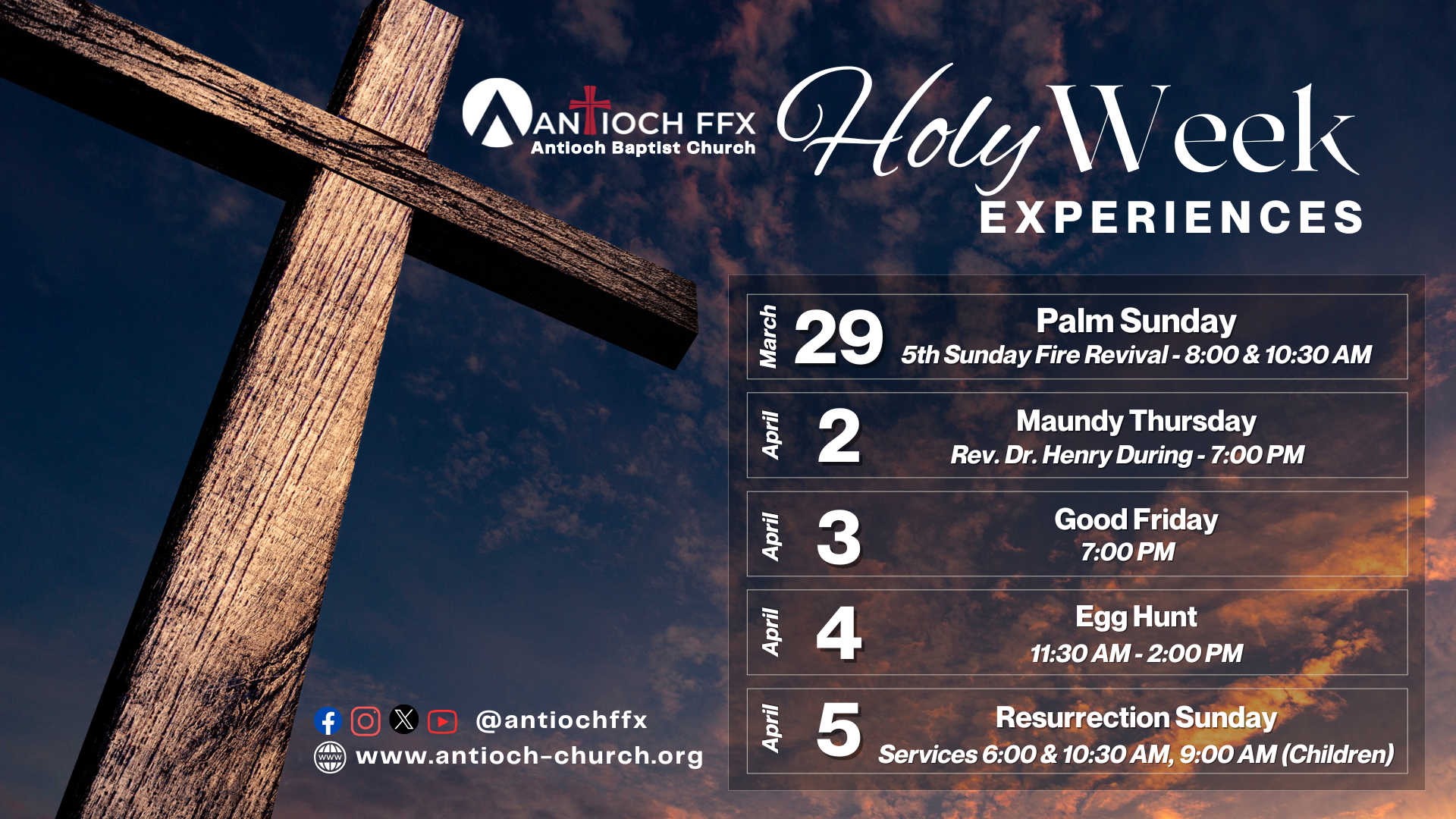 Join us for a powerful and transformative Holy Week as we journey together through worship, reflection, revival, and celebration. From Palm Sunday to Resurrection Sunday, each gathering is designed to draw us closer to Christ and deepen our faith as a six-generational church family.