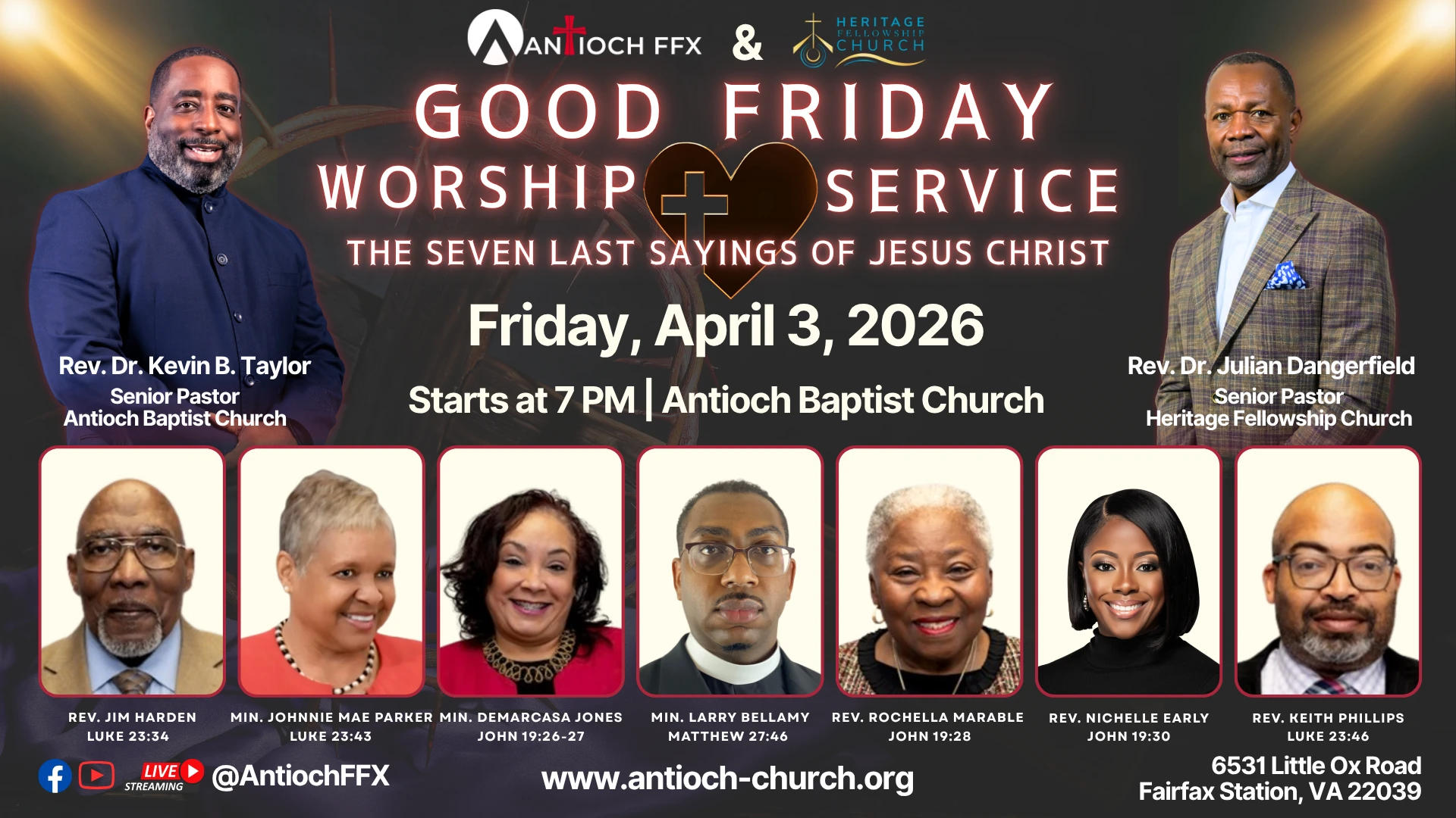 Join Antioch for a powerful evening of worship and reflection as we observe Good Friday through the preaching of The Seven Last Sayings of Jesus Christ. This special service will feature several anointed ministers sharing brief messages centered on the final words Christ spoke from the cross as we prepare our hearts for Resurrection Sunday.