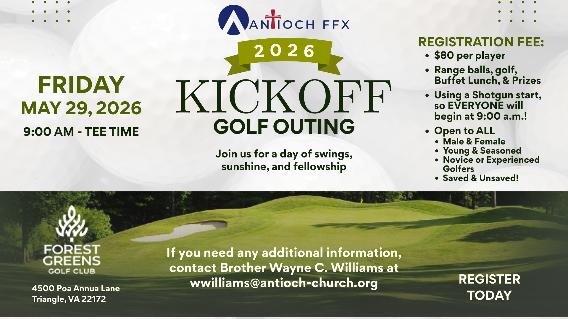 Join Antioch FFX for our 2026 Kickoff Golf Outing, a fun day of fellowship, friendly competition, and great golf. Whether you're an experienced golfer or just looking to enjoy time outdoors with the Antioch community, this outing is a great way to connect and start the season together.