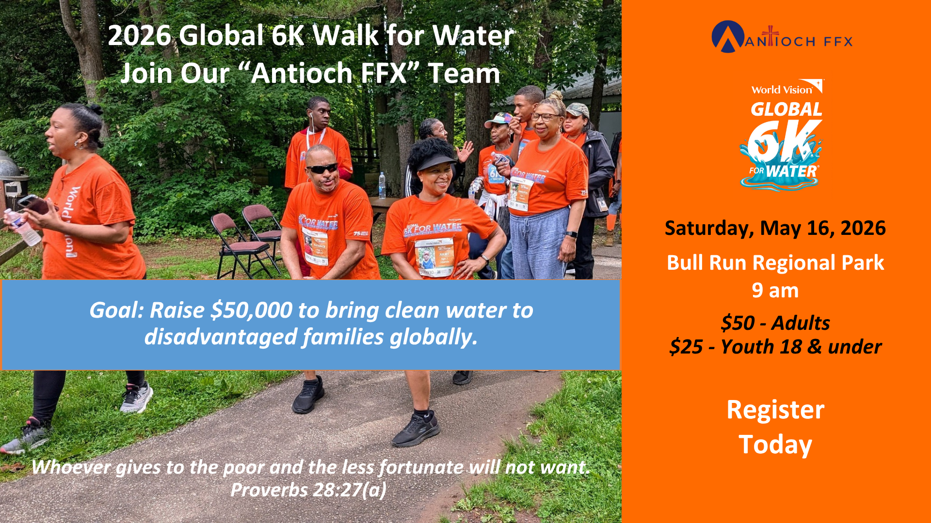 Step out, make an impact, and help bring clean water to communities around the world! Antioch FFX is joining the World Vision Global 6K Walk for Water, and we want YOU to be part of the movement.
