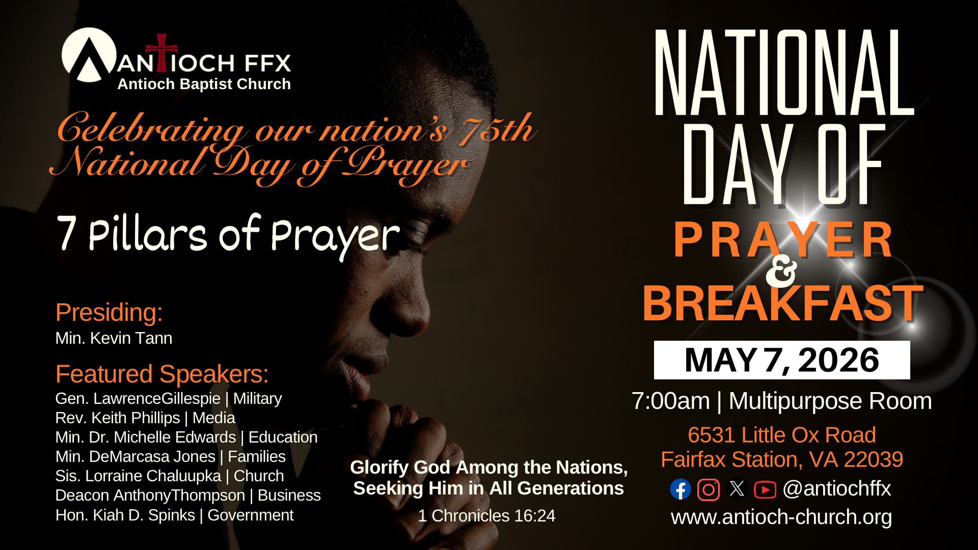 Join Antioch Baptist Church as we come together to celebrate our nation’s 75th National Day of Prayer with a powerful morning of worship, reflection, and fellowship.