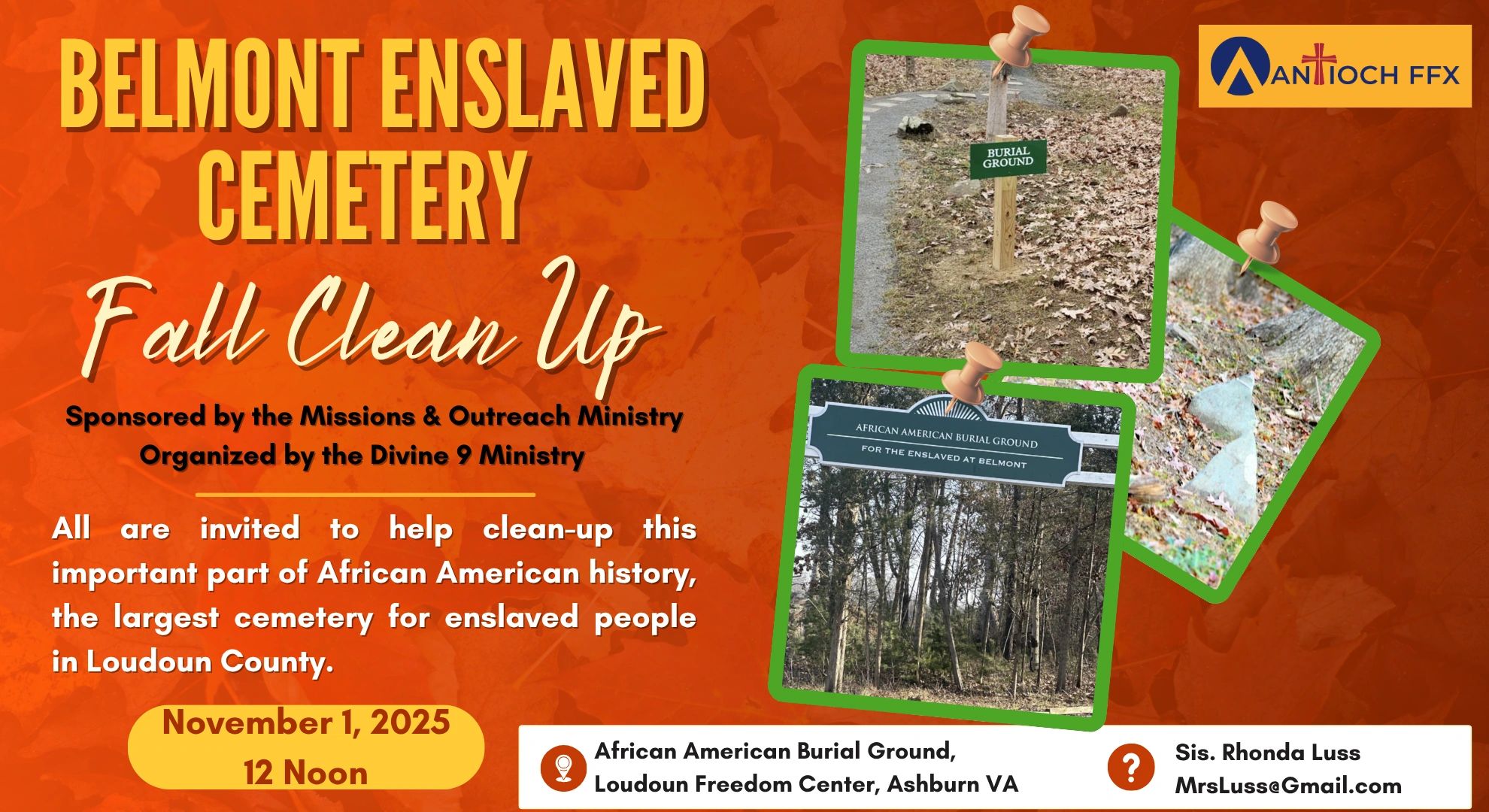 Join Antioch’s Missions & Outreach and Divine 9 Ministries for the Belmont Enslaved Cemetery Fall Clean-Up on November 1, 2025, at 12 Noon. Help honor and preserve this vital part of African American history—the largest cemetery for enslaved people in Loudoun County.