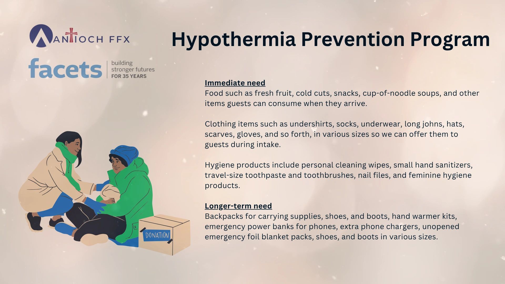 Antioch Baptist Church partners with Fairfax County’s Hypothermia Prevention Program to provide safe shelter, hot meals, and essential support during the winter months. Together, we help ensure no one sleeps outside, offering warmth, dignity, and hope through the love of Christ.