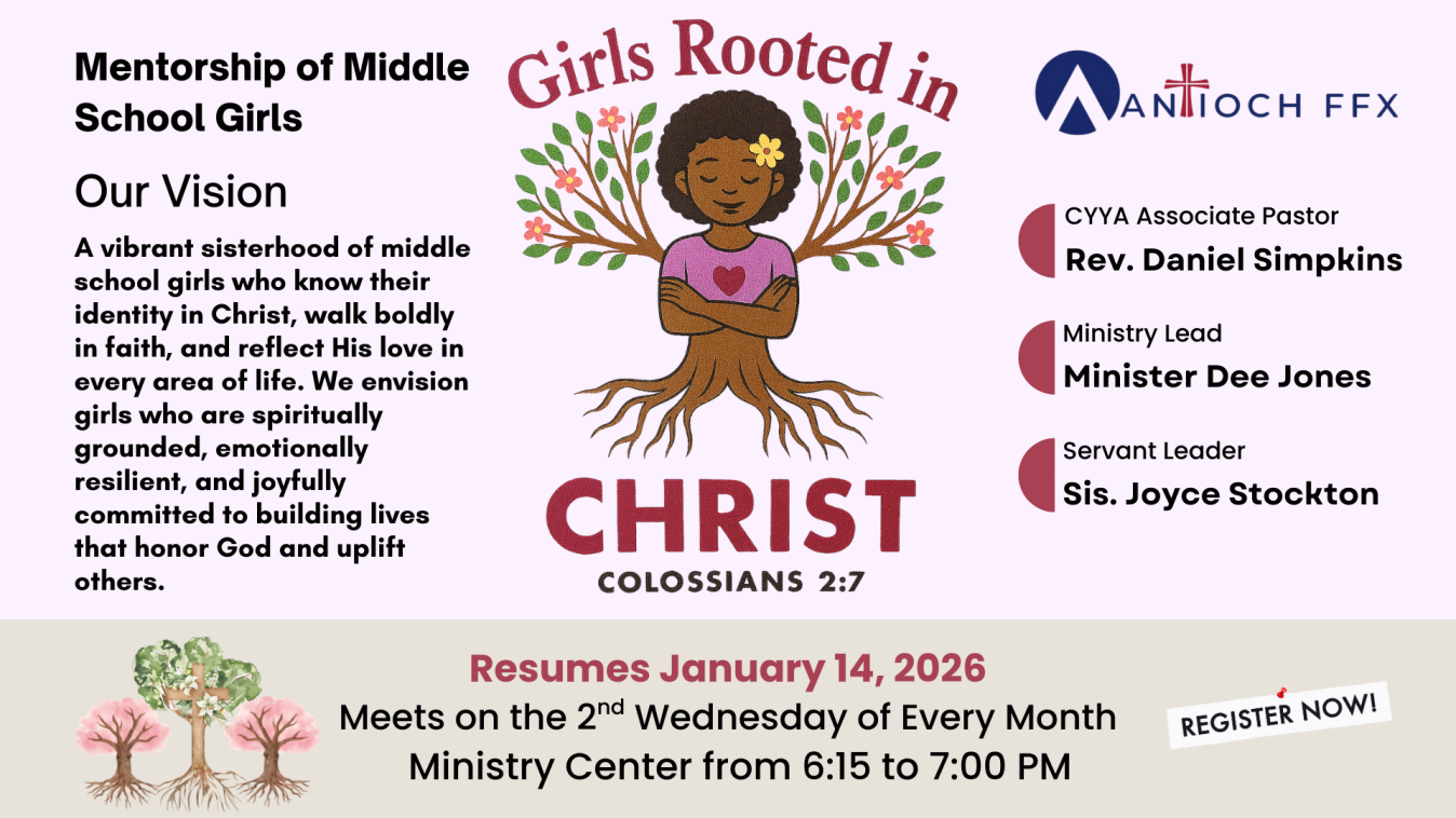 A vibrant sisterhood of middle school girls who know their identity in Christ, walk boldly in faith, and reflect His love in every area of life. We envision girls who are spiritually grounded, emotionally resilient, and joyfully committed to building lives that honor God and uplift others. Contact Min. Dee Jones.