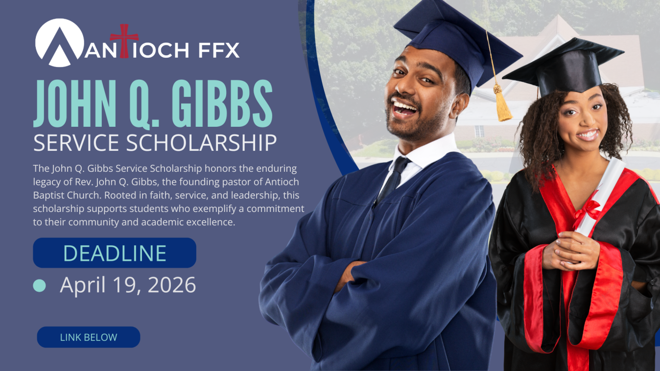 The John Q. Gibbs Service Scholarship honors the enduring legacy of Rev. John Q. Gibbs, the founding pastor of Antioch Baptist Church. Rooted in faith, service, and leadership, this scholarship supports students who demonstrate a strong commitment to their community and academic excellence.